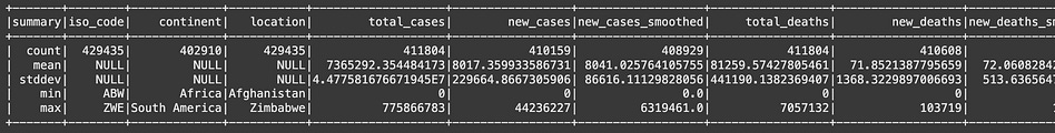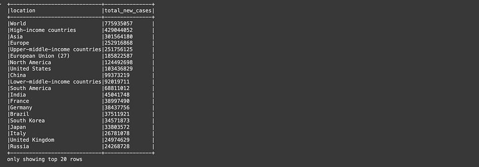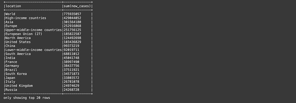 df.groupBy(”location”).sum(”new_cases”).orderBy(F.desc(”sum(new_cases)”)).show(truncate=False)