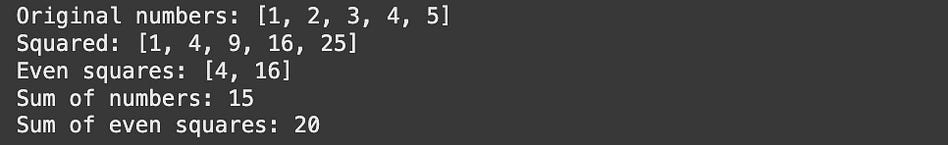 print(”Sum of even squares:”, even_squares.reduce(lambda a, b: a + b)) # recomputes again
