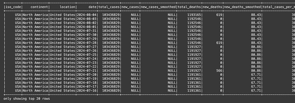 df.filter(df.location == “United States”).orderBy(F.desc(”date”)).show()