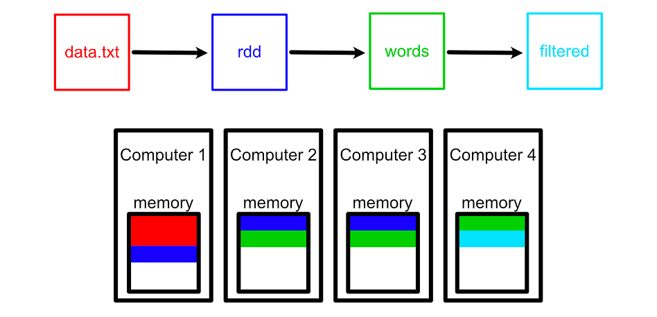 The “Resilient Distributed Dataset”(RDD) is one of the most fundamental ideas in Spark. RDDs represent distributed collections of data and define what operations should be computed to transform that data across a cluster. They don’t hold the data themselves — instead, they record where the data came from and what transformations should be applied. We’ll cover this more in depth later, for now you can think of RDDs as a record of how data changes throughout a data processing pipeline.