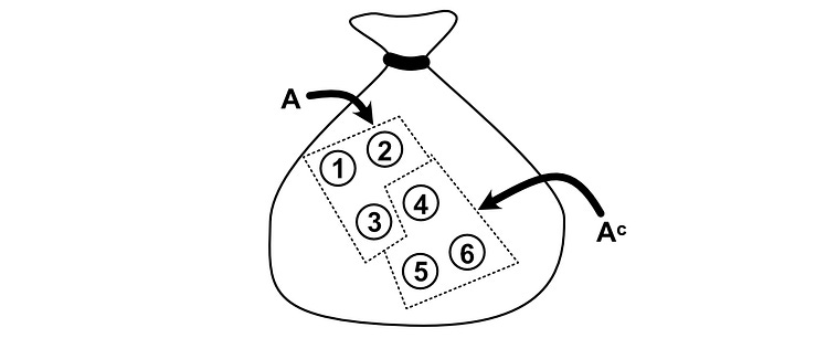 Using an example to hopefully cement the idea of a complement; if we had a bag of pebbles, we could define event A as if we selected pebbles #1, #2, or #3. The “complement” of A would be all of the pebbles that are not in event A, so pebbles #4, #5, and #6.