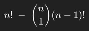 See, imagine a case where there are two books in the same spot they started in. That case would be counted in both of the books (n-1)!‘s, meaning we over subtracted and accounted for that case twice. We can figure out how many groups of two people there are using n choose 2, and multiply that by how many sequences there are to add them back in.