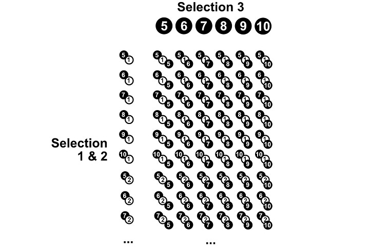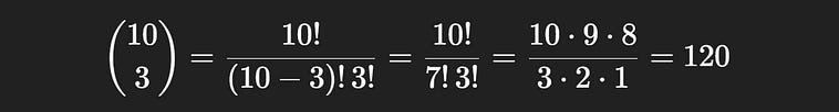 You might be able to read between the lines, but there are 10 * 9 * 8 * 7 * 6 * 5 * 4 * 3 * 2 * 1 = 3,628,800 possible outcomes when sampling 10 stones out of a bag without replacement. This idea of multiplying the subtraction of one less than a number until you hit 1 is pretty common, which is why it’s often denoted with the symbol !, which stands for “factorial”. 3! = 3*2*1 = 6 , or 5! = 5*4*3*2*1 = 120 , for instance. 3! counts how many ways you can choose a sequence out of three things without replacement, and 5! counts how many ways you can choose a sequence out of five things with replacement. These both assume you’re selecting all of the elements from the set. If you’re selecting a specific number of things, say 4 things out of a bag of 10, you would do 10 * 9 * 8 * 7, stopping after you got to the 4th selection.
