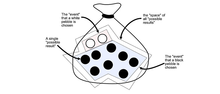 The “space” is all possible outcomes. No matter which pebble we choose, we will choose one of the pebbles in the bag.