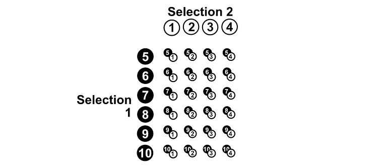 We can use the multiplication rule to figure out how many combinations there are of the first two selections.