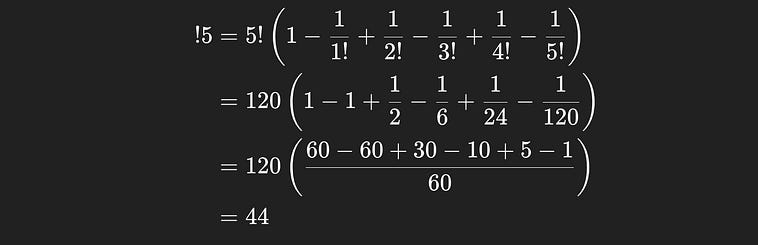 Calculating the number of ways of organizing the books so that none of them are in the same spot… Well… I said it’s easier, but it’s not easy. The idea of shuffling things so that no items are in the same spot is called a “derangement”. A derangement, by definition, is a permutation where no items end up in the same spot.
