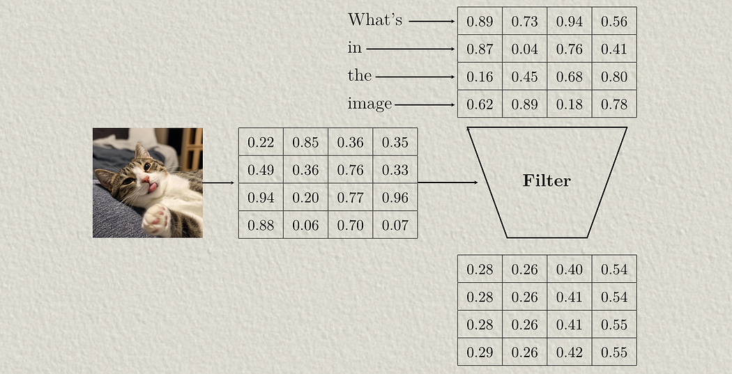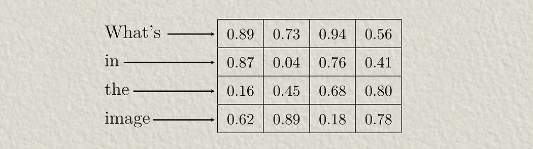 Depending on the application, a mask might be applied to cross attention so that only certain query source input tokens can interact with certain key-value source input tokens. We won’t be doing that in this example because we want all image data to interact with all text data, but you can get an idea of how masking works from another one of my by-hand articles.