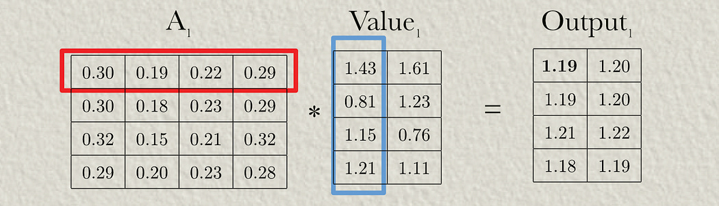 Now that we’ve calculated the attention matrix, we can multiply it by the value matrix to construct the output of the attention head.