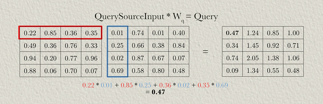 Now that we have weight matrices for our model, we can multiply them by our inputs to generate our query, key, and value. In this example we’ll multiply the weight matrix for the query with the image data to generate the query, and the key and value weight matrices by the text data to generate the key and value. Recall that in matrix multiplication, every value in a row of the first matrix is multiplied by the corresponding values in a column in the second matrix. Those multiplied values are summed to represent one value in the output.