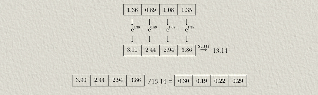 Meaning a value in a row is equal to e raised to that value, divided by the sum of e raised to all values in that row. We can softmax the first row of the Z matrix: