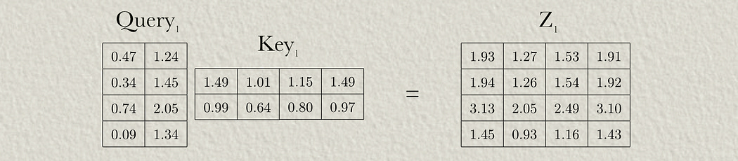 To construct the attention matrix, we’ll first multiply the query and key together to construct what’s commonly referred to as the “Z” matrix. We’ll only be doing this for attention head 1, but keep in mind all of these calculations are also going on in attention head 2.