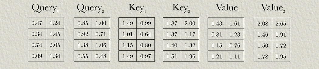 In this example we’ll use two attention heads, meaning we’ll do cross attention with two sub-representations of the input. We’ll set that up by dividing the query, key, and value in two.