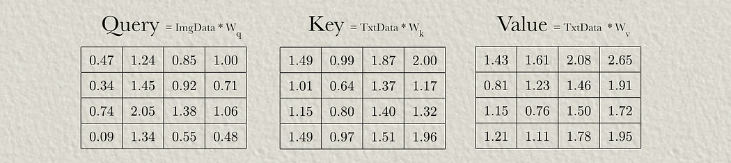Once the image data has been multiplied by the query weights, and the text data has been multiplied by the key and value weights, we have our query, key, and value.